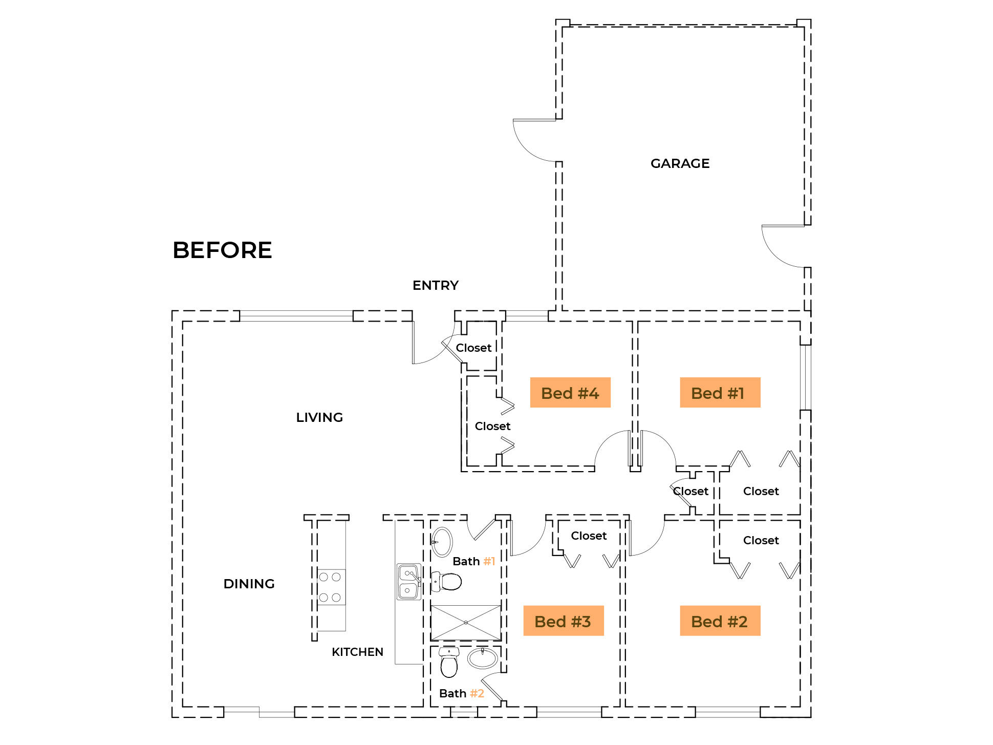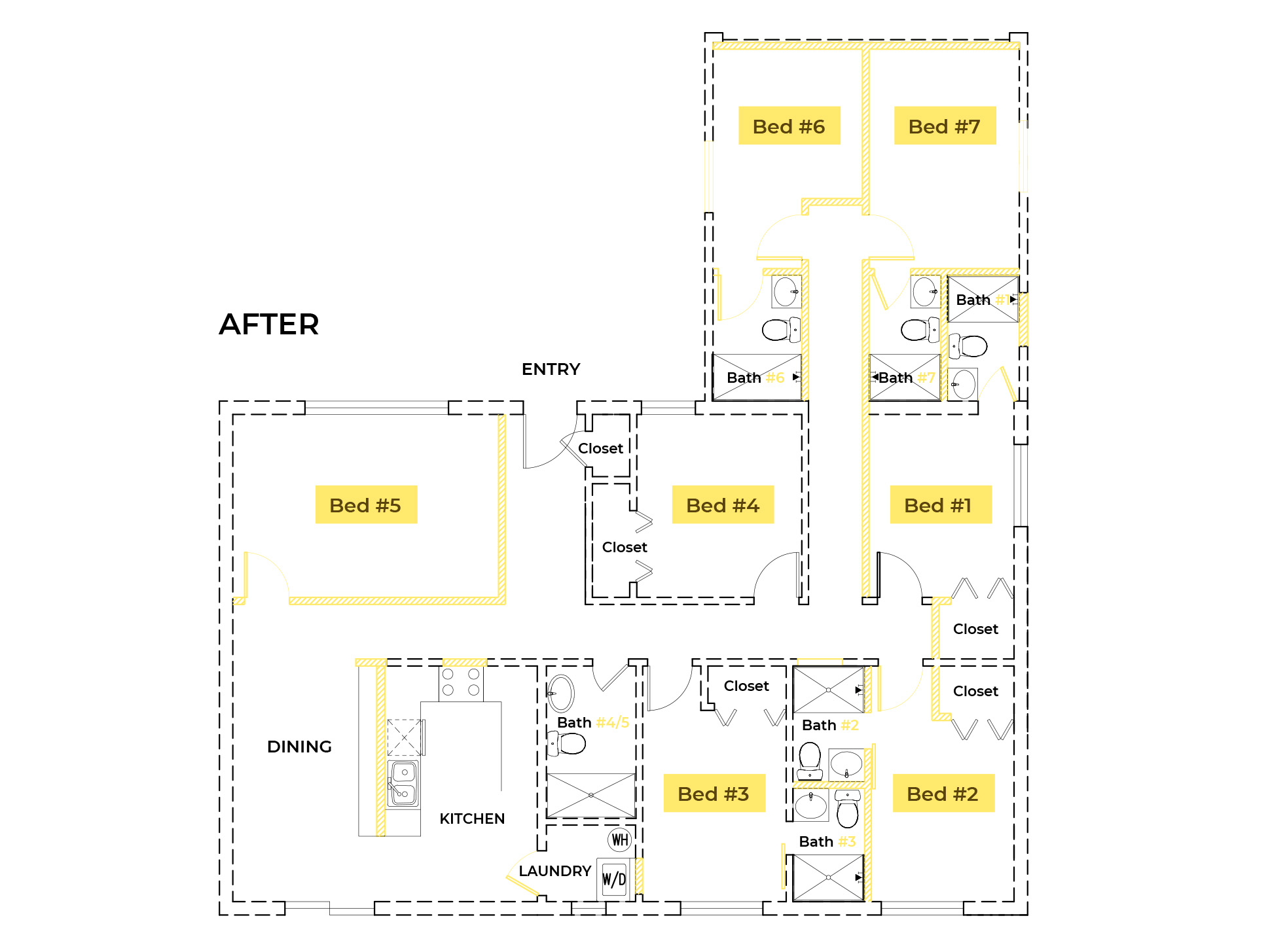Originally a 4-bedroom, 2-bathroom single-family home, the property has been fully renovated into a co-living space featuring 7 individual rooms, with 2 rooms sharing a common bathroom and 5 rooms each having a private ensuite bathroom.